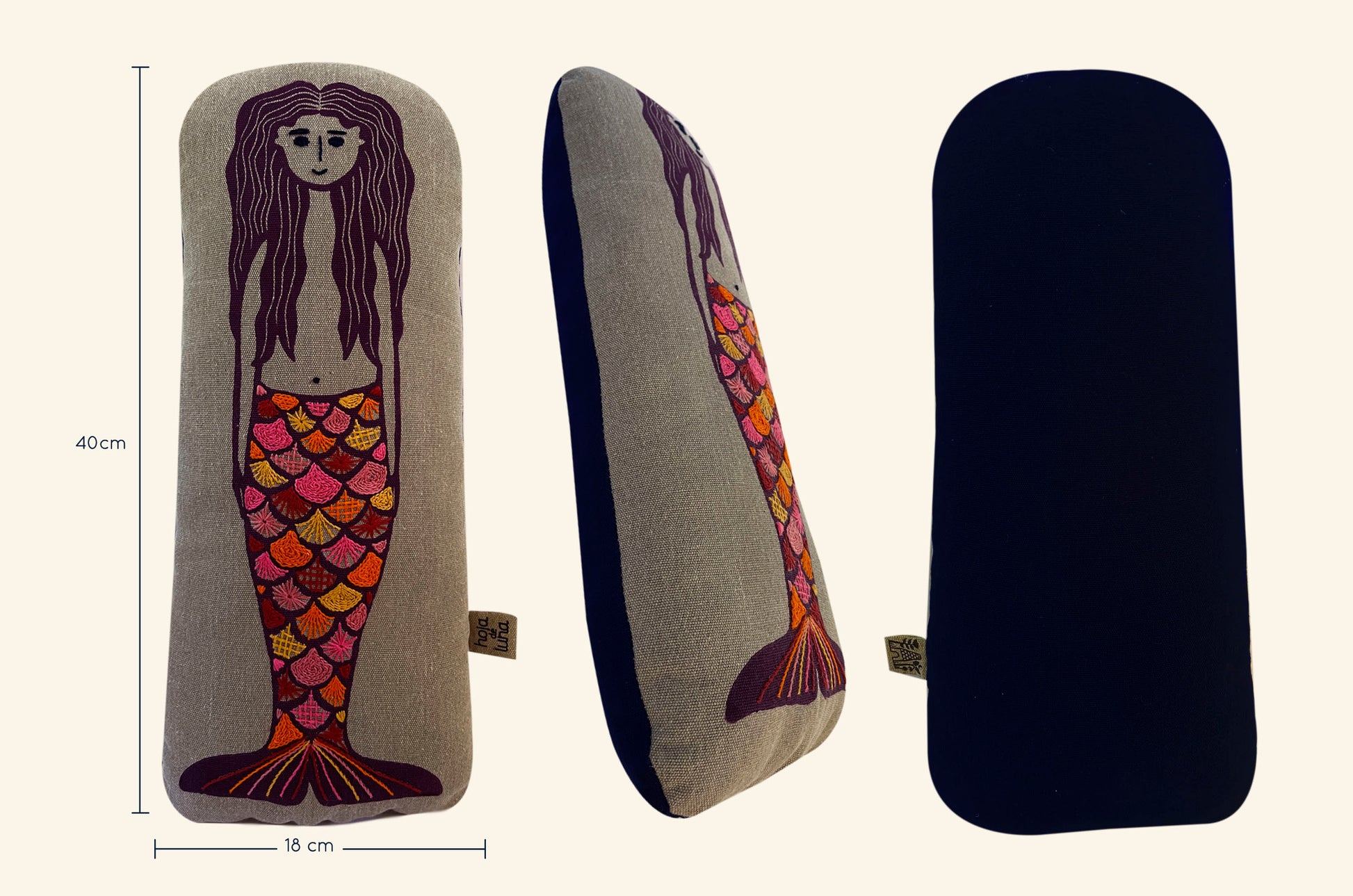 Cada Sirena es única, están bordadas a mano e impresas artesanalmente con la técnica de linograbado con tintas especiales para tela no tóxicas. Si quieres saber más sobre este proceso de impresión te invito a visitar el blog En el taller