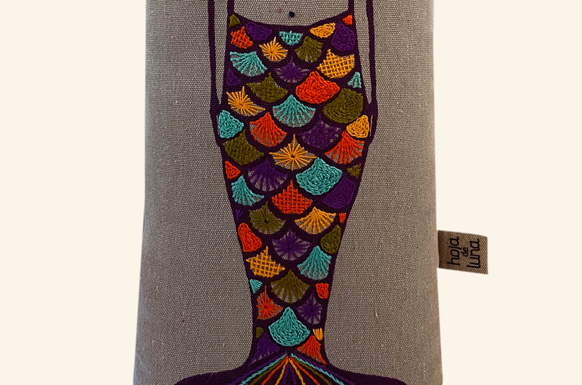 Cada Sirena es única, están bordadas a mano e impresas artesanalmente con la técnica de linograbado con tintas especiales para tela no tóxicas. Si quieres saber más sobre este proceso de impresión te invito a visitar el blog En el taller