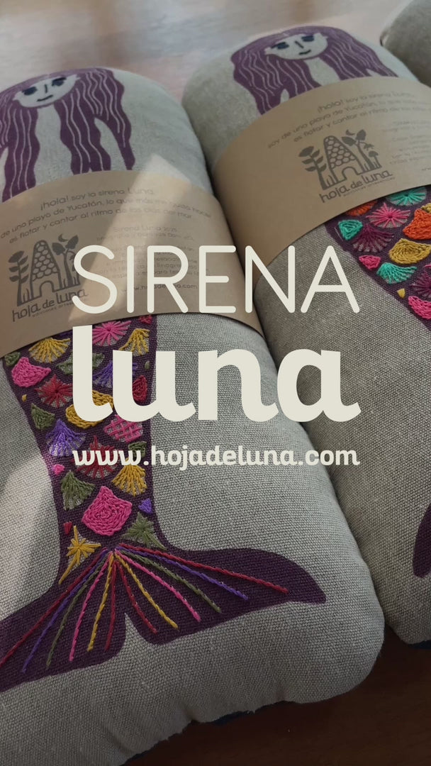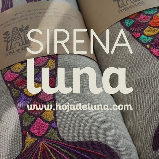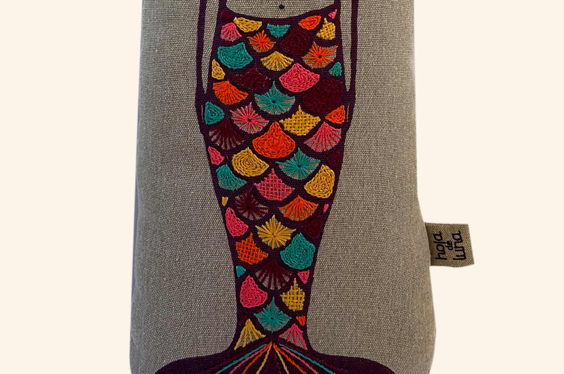 Cada Sirena es única, están bordadas a mano e impresas artesanalmente con la técnica de linograbado con tintas especiales para tela no tóxicas. Si quieres saber más sobre este proceso de impresión te invito a visitar el blog En el taller