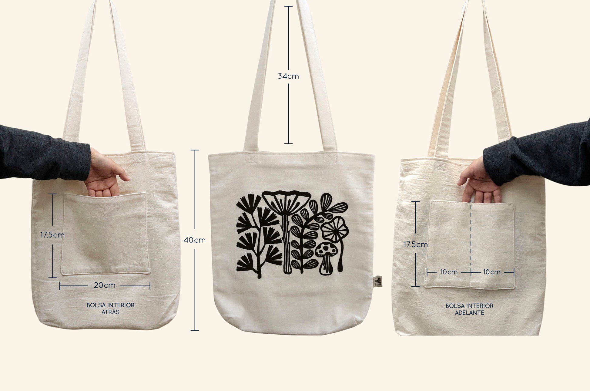 Todas las Tote Bags están confeccionadas en el taller, están forradas para darles más soporte. En el interior tiene bolsitas adelante y atrás para guardar cosas pequeñas y que no se pierdan en el fondo de la bolsa.
