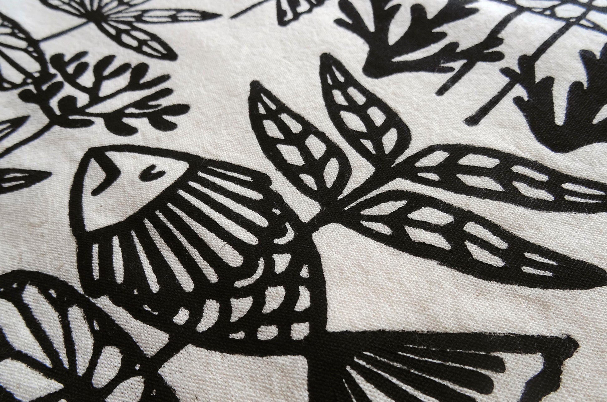 La impresión está hecha artesanalmente con la técnica de linograbado, si quieres saber más sobre este proceso de impresión te invito a visitar En el taller.