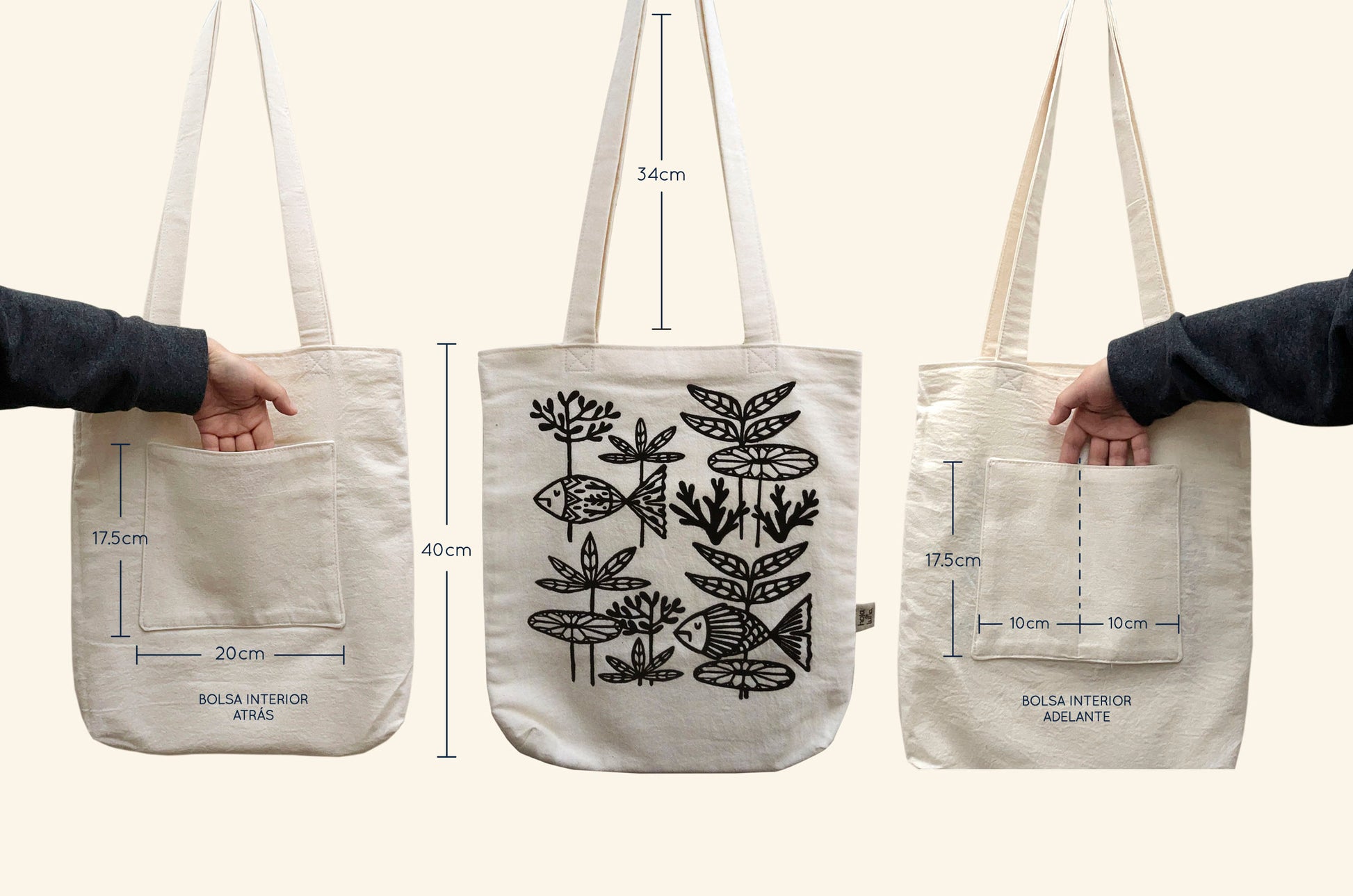 Todas las Tote Bags están confeccionadas en el taller, están forradas para darles más soporte. En el interior tiene bolsitas adelante y atrás para guardar cosas pequeñas y que no se pierdan en el fondo de la bolsa.